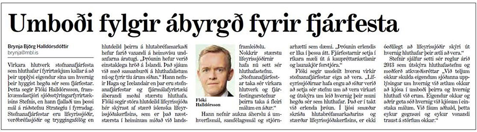Flóki lýsti þróun eignarhalds á skráðum hlutabréfum á Íslandi og auknu vægi stofnanafjárfesta í því sambandi. Stefnir setti sér reglur um meðferð umboðsatkvæða árið 2013 og í endurskoðuðum reglum árið 2015 kveður á um að Stefnir birtir hér á heimasíðu sinni hvernig meðferð atkvæða er háttað. Hlutdeildarskírteinishafar í sjóðum Stefnis geta því fylgst með hvernig Stefnir ráðstafar atkvæðum á hluthafafundi fyrir þeirra hönd og vonast er til að þetta aukna gagnsæi í starfsemi Stefnis sé til hagsbóta fyrir hlutdeildarskírteinishafa sjóðanna.