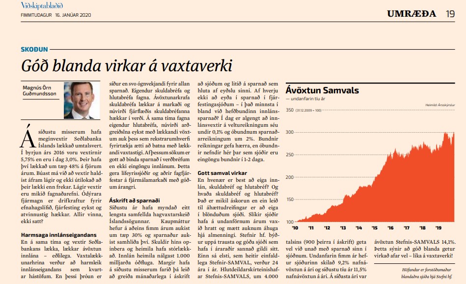 Í Viðskiptablaðinu í dag var birt áhugaverð grein eftir Magnús Örn Guðmundsson, forstöðumann blandaðra sjóða hjá Stefni. Þar ræðir hann um harmsögu innlánaeigandans í kjölfar vaxtalækkana, áskrift að sparnaði og hvernig gott samval virkar.
