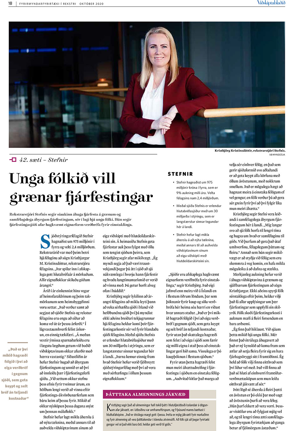 Kristbjörg Kristinsdóttir, rekstrarstjóri Stefnis, ræddi við Viðskiptablaðið um árangur og markmið Stefnis. Þar kemur hún til að mynda inná það að Stefnir er búið að vera leiðandi í samfélagslega ábyrgum fjárfestingum hér á landi.