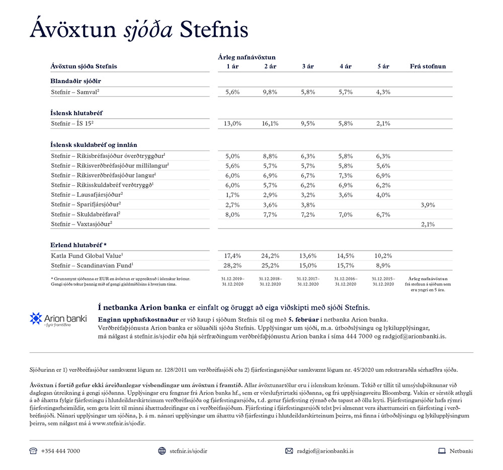 Stefnir hefur birt ávöxtun m.v. árið 2020. Samantektina má sjá hérna fyrir neðan.